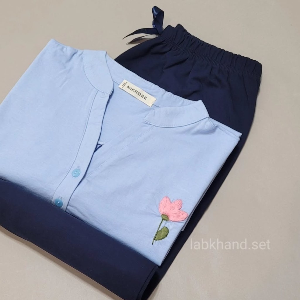 یقه شومیز دارای سه دکمه است که تا زیر سینه باز میشود